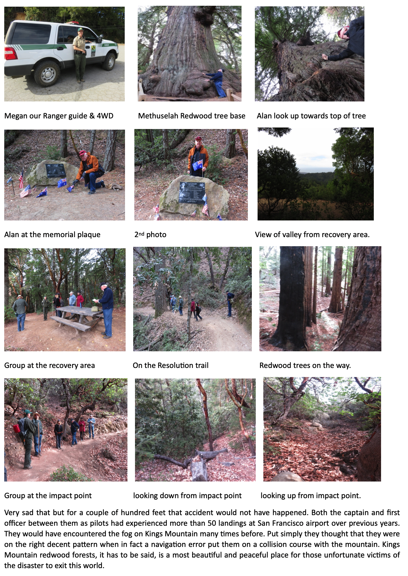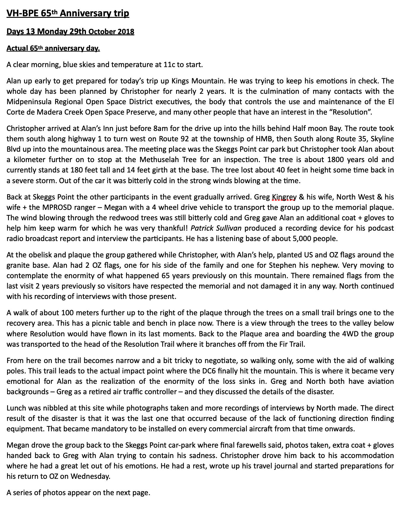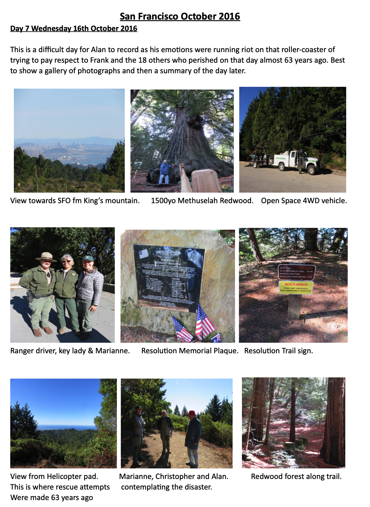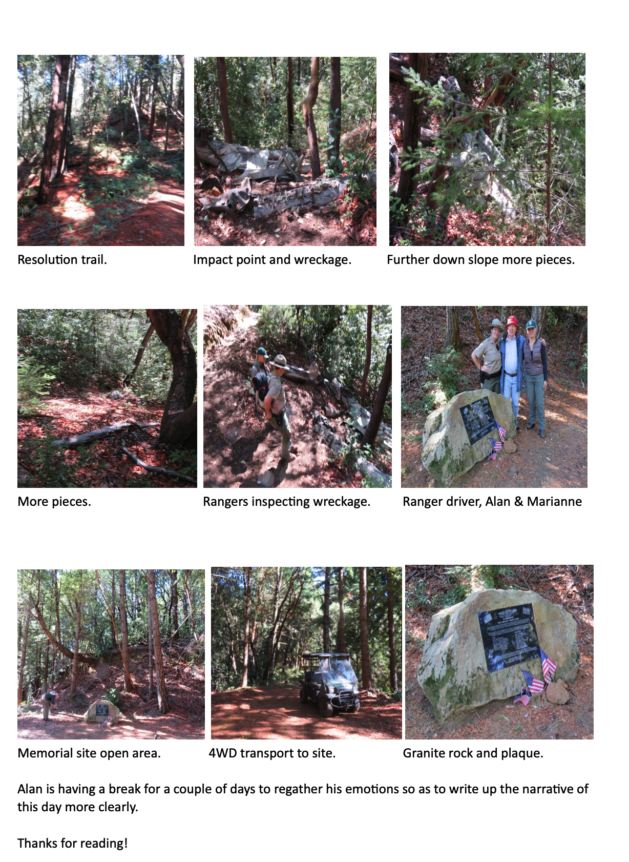 April produced a visit, to the Bay Area , from Chris Purcell and his wife, Kerrie, from Australia. Mr. Purcell is the son of “RESOLUTION” pilot, Bruce Dickson. Name difference is because of adoption. Christopher O'Donnell escorted the pair to the plaque , in the woods, memorializing the fateful day and crash.