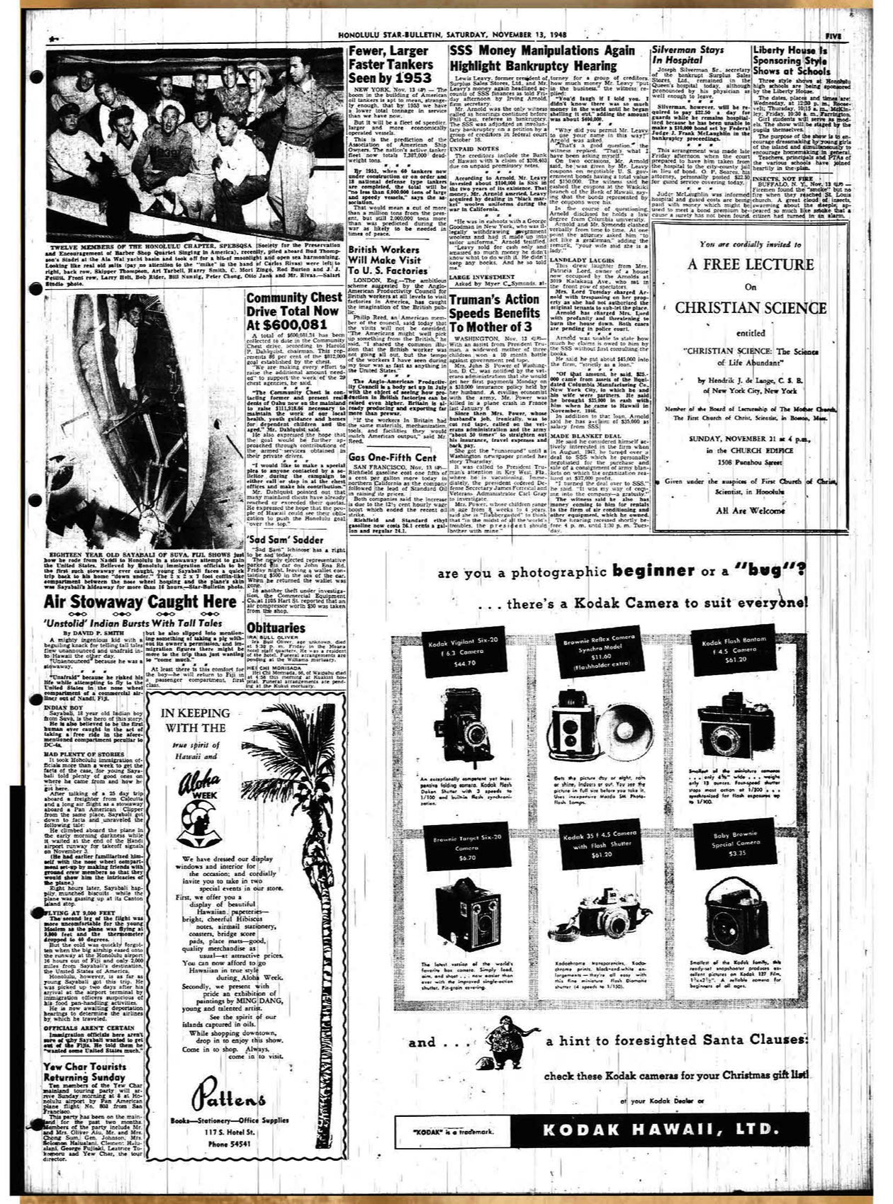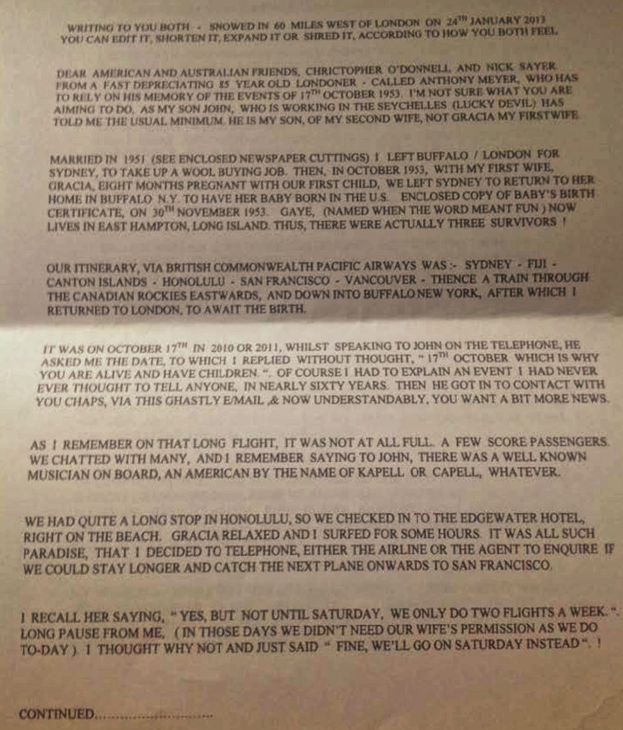 And finally, a most fascinating email was received from a Mr. John Meyer, informing me that his father had flown from Sydney to Hawaii, along with his wife, on Flight 304. During their brief lay-over, he was enamored by Honolulu and decided that he and his wife would wait for another BCPA flight and spend a few days in this tropical paradise. Of course RESOLUTION flew on and crashed hours later. I spoke with the older Mr. Meyer by 'phone, now living in London and he confirmed this quirk of fate