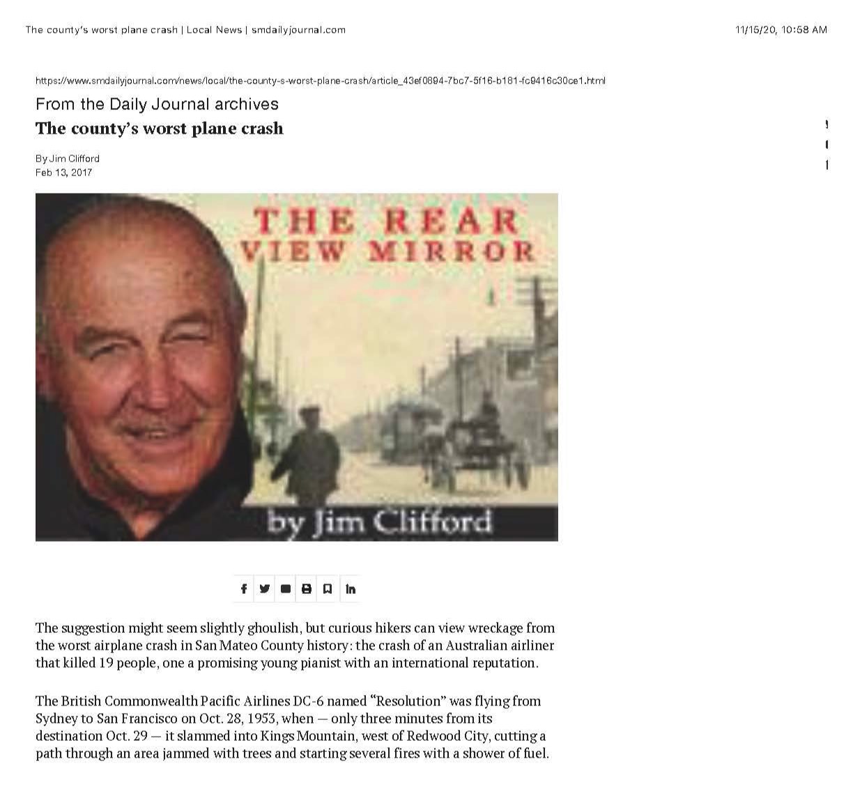 The passengers on flight 304, a BCPA DC-6 bound for San Francisco in October 1953 had no inkling of their upcoming fate that foggy morning. And for five years, the Resolution committee, lead by Christopher O'Donnell, has waged a quiet effort to commemorate this tragic event and give it the recognition it is due to honor the passengers and crew, also without a clear view of the final outcome.